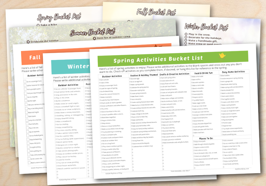 Click the images or links below to learn more about each of the seasonal arts, crafts, and nature activity ideas in the Rhythms of Play Learning Center. Bookmark this page and check back to see what's new, or JOIN THE PLAY CLUB to have each digital curriculum product you see below (and more) added to your product dashboard every month. Click to access the FREE Bucket List Ideas directly below to see how the product dashboard works.
