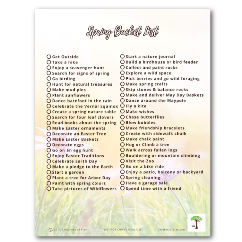 Next, please visit Rhythms of Play for step-by-step instructions and fun tips for each spring activity on the bucket list!