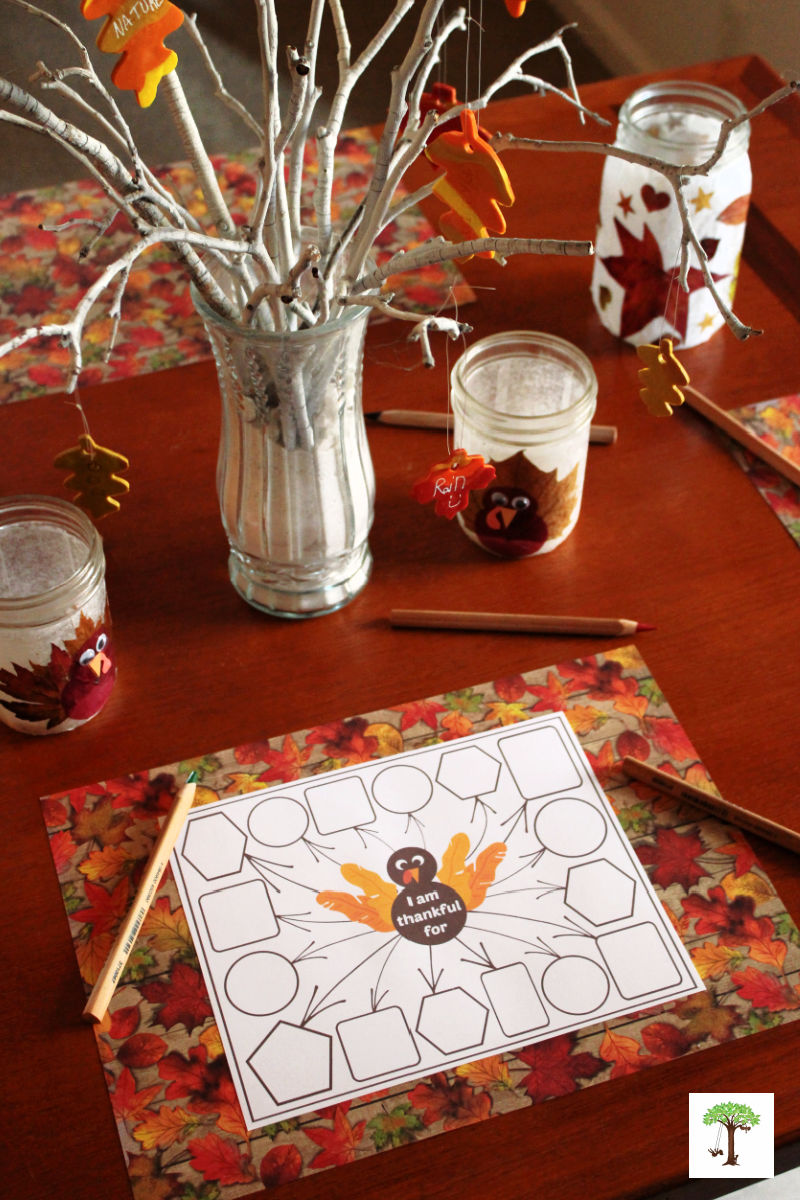 You might also enjoy making the adorable turkey leaf lanterns, simple leaf lanterns, or the Thankful Tree displayed on the table in the photograph. Please visit Rhythms of Play to get the DIY details for each Thanksgiving craft project!