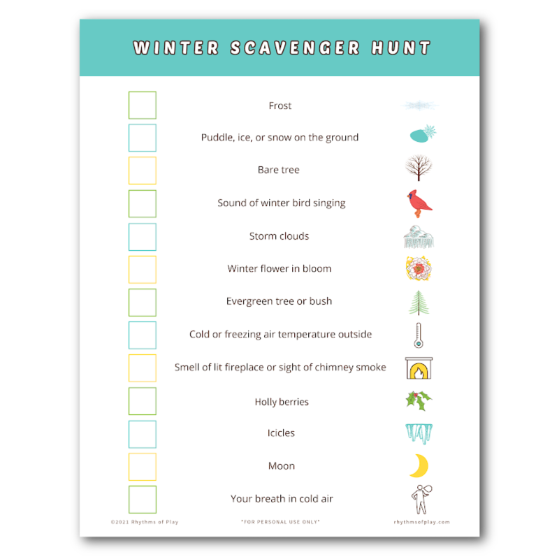 After you download and print the Winter Scavenger Hunt printable, please head back to Rhythms of Play to learn all about this winter learning activity for preschoolers and kindergarteners (and their caregivers)!